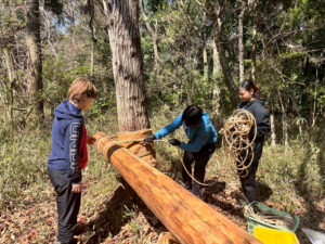 1日目は、野性の森にてラインナップやビームの麻縄の巻き直し作業を中心に実施しました。新専攻生の積極的な協力で不安であった角縛りもスムーズに行うことができました。